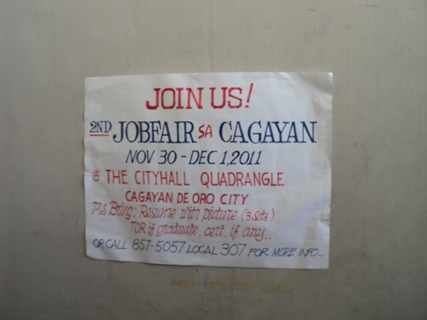 The city of Cagayan de Oro will be holding the 2nd Job Fair sa Cagayan de Oro 2011 from November 30 to December 1. The venue for the event will be at the City Tourism Hall. Applicants are asked to bring their resume with picture (3 sets), TOR (if graduate) and certificates (if any).